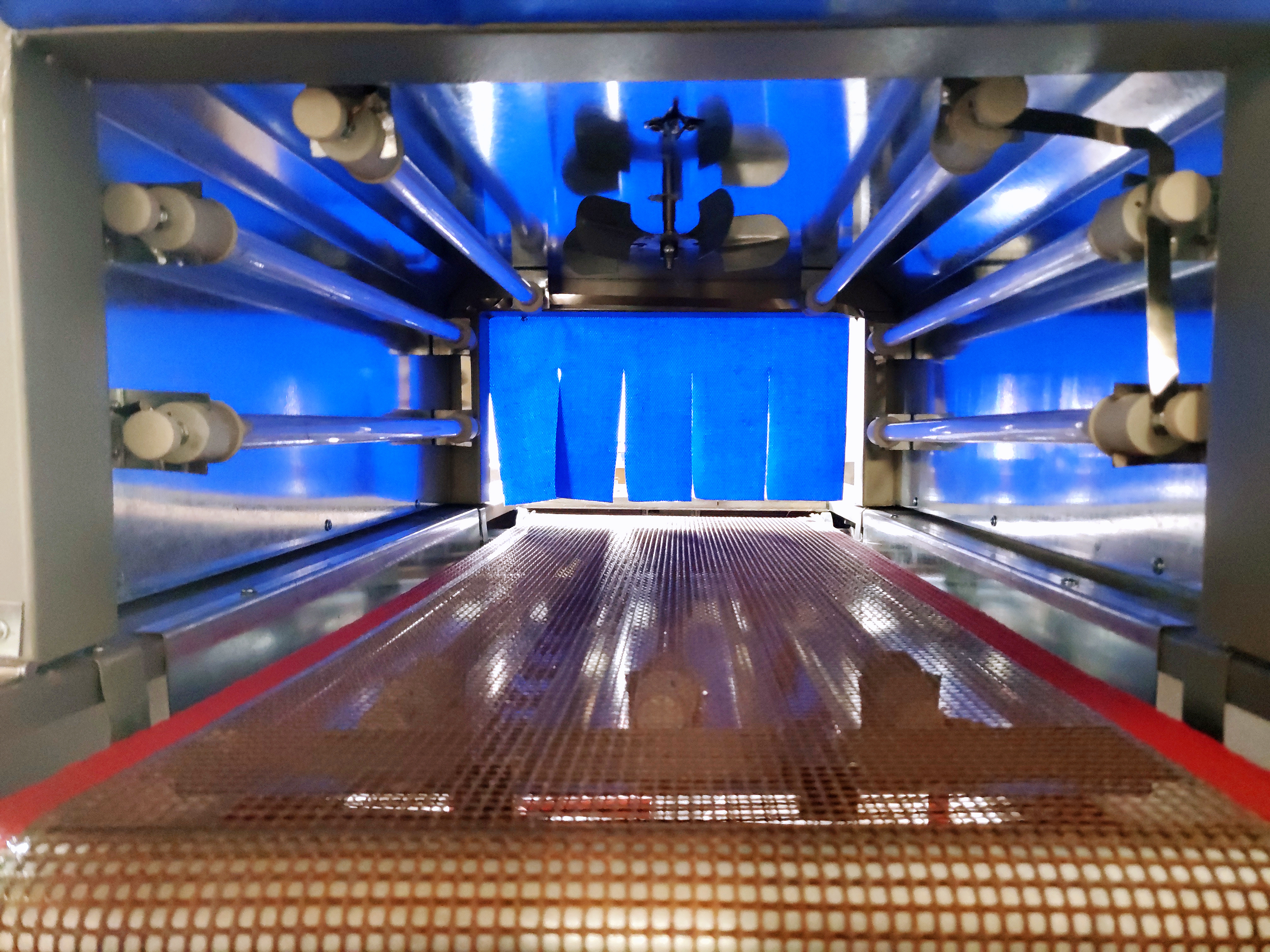 5、收縮爐輸送鏈采用進口材質特氟龍網袋輸送,輸送平穩且不燙膜;