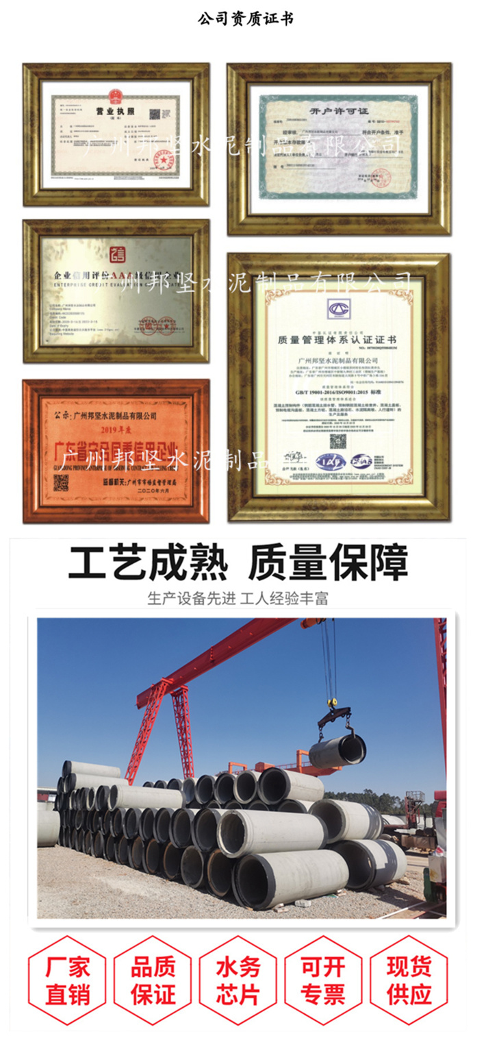 廣州市邦堅(jiān)水泥制品有限責(zé)任公司是一家大中型鋼筋混凝土排水管、水泥排水管生產(chǎn)商,有著很多年的鋼筋混凝土排水管制造工作經(jīng)驗(yàn),是一家整體實(shí)力強(qiáng)勁的生產(chǎn)商,是廣州水利公司工程建設(shè)公司資料庫(kù)的挑選生產(chǎn)廠家。