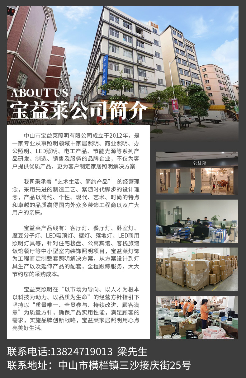 憑借腳踏實地、務實進取的創業精神,一幫勤奮務實的寶益萊人,在拼搏中全力地奉獻著才華與汗水,在燈光中盡情地詮釋著文化與內涵。秉承“匠心做好每一盞燈,用心服務好每一個客戶”的經營理念贏得了廣大消費者的認可。